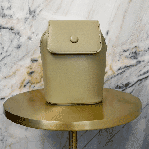 Crafted from premium leather, its upright silhouette features clean lines and a distinctive button closure, creating an understated yet sophisticated aesthetic.